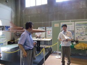 広い敷地にさまざまな実験施設が点在しています。たとえば、機体が受ける風の流れを見る風洞実験施設は四つあり、そのうちの一つで説明を伺いました。またこの写真とは別の風洞ですが、国産初の飛行機MRJもこちらの風洞でのべ1000時間以上の実験をしたそうです。風洞実験は古くはライト兄弟の時代から行われています。